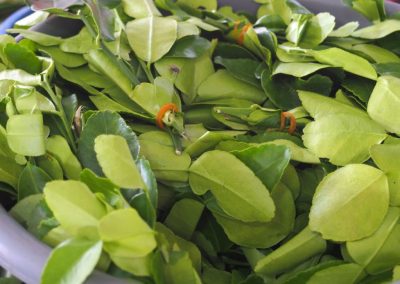 1.將長條綠辣椒、檸檬葉、檸檬香茅、火炬薑花切細備用。