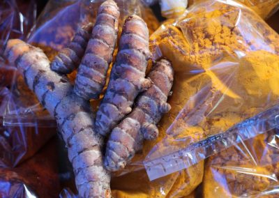 2.再加入3匙薑黃粉、2匙芫荽粉和一小把石栗、水些許,打成香料泥。