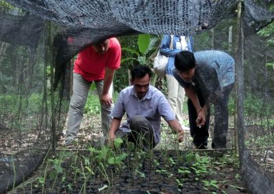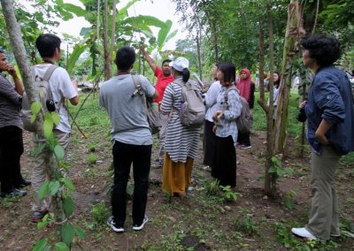 夥伴們都是第一次來到胡椒生長的環境,這才明白原來胡椒必須攀附樹木生長,Juanda翻開葉子讓我們更清楚看見它的共生現象,大家發出了驚嘆。這戶人家的三十棵胡椒樹已種了三個月,剛發現共生的樹木感染病害,使得胡椒無法吸取足夠養分,因此正在四處尋求解決之法。另一戶的園子裡是海嘯後所剩不多、原生種的胡椒,兩個星期前開始用扦插法種植,一段時間後將移植到肥沃的溫泉土壤區。此外,我們得知Juanda與村長、友人正在共同研究香料應用的可能性,例如做成肥皂、精油等,增加附加價值,而不只是用在料理上,期望社區居民有更好的收入。過程中我們認識了這個村(Ie Seuun village)的村長,聊上了幾句,實在難以相信,他只有三十三歲。