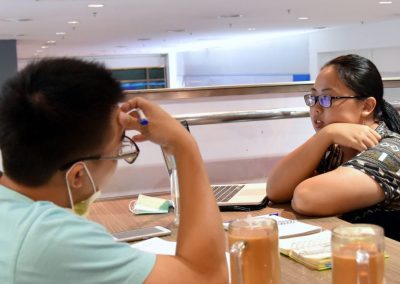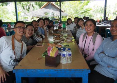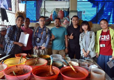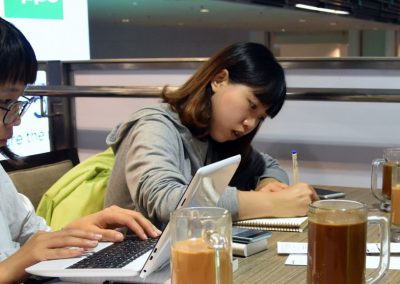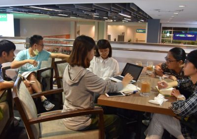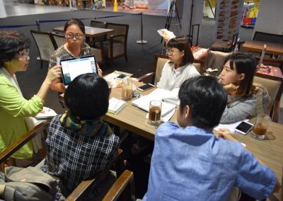 候機室內,夥伴各自沉澱心緒,待傷感逐漸舒緩,便互相分享在亞齊的種種感觸,喬安和梅子則在一旁討論著粉絲專業的經營問題,思索如何吸引更多人關注。降落吉隆坡機場後,團隊尋覓到一家可以久待的餐廳,解決午餐外,更趁四個小時的接機時段,展開返台後生活營「分享會」的討論,敲定了內容大綱與分工模式。我們先以料理(芸芸、喬安、婉琦)與文化(婉禎、韋婷、瑋哲)兩方向進行分組討論,並決議以說故事的形式呈現亞齊行的內容。料理組快速發展出「市場、香料、家戶料理、手食」四個子題,文化組礙於範疇太廣,討論陷入膠著,在團隊共同商討後,決定以「清真寺、穆斯林女性服裝」作為主軸。