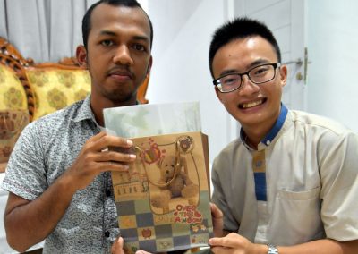 在聚會尾聲,夥伴各自將禮物送到亞齊朋友們面前。這些是梅子從台灣幾間頗具代表性的文化推廣機構精選的文創商品,內容包括了筆記本、資料夾,以及頗具巧思的書籤吊飾。一群人笑鬧著研究如何「破解巧思」,讓書籤吊飾順利撐開掛起,增加了很多把玩禮物的樂趣。梅子將一只看起來與亞齊媽媽所送那條頭巾很搭的景泰藍色「台灣包」,托Agi帶回給Ibu Juwita,再度表達為我們做料理的感謝。六點半過後,等待亞齊朋友完成禮拜後,大家便一同前往海邊餐廳(Banda’s Seafood)吃晚餐。