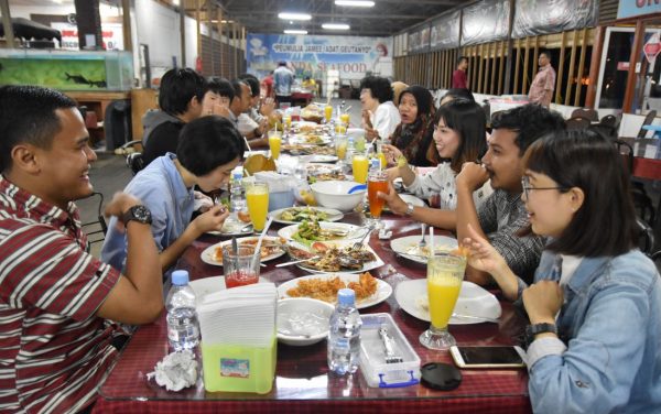 我們今天上午變回觀光客,到禮品店為自己以及台灣的親朋好友,購買紀念品。下午與亞齊朋友在宿舍大廳開惜別會,席地而坐,並決定這次由他們主導交流的話題,我們送禮致謝。晚上一起去海邊的一家餐廳用餐,滿滿的海鮮時蔬料理,風格出乎意料地「台式」,一時之間,讓人有種已回家的錯覺。最後我們在車前逗留,說了好多好多聲珍重再見,為惜別會畫下句點。