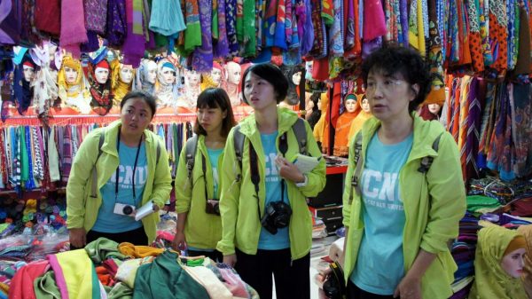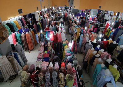 為了參觀亞齊著名的拜圖拉赫曼大清真寺(Mesjid Raya Baiturrahman),我們前往亞齊最大的服飾賣場「亞齊賣場」(Pasar Aceh)挑選頭巾。看著色彩繽紛的頭巾,夥伴們不知該從何下手,只好一一拿到臉旁比對,婉禎一眼瞧見自己喜歡的款式,試戴後沒問題,二話不說便買了下來。芸芸東挑西選,每嘗試一個都會問問身邊的人自己是否好看,婉琦買了與芸芸同款不同色的頭巾。韋婷在店家的協助下,一個一個進行嘗試,附近的亞齊人也跑來看韋婷如何試戴,一邊給予讚美。瑋哲和喬安除了陪伴女性團員購買頭巾,還肩負起拍攝照片的責任,讓我們能安心地挑選頭巾。梅子一面試戴一面心理犯嘀咕,最後決定不違背自己的想法,說出了「不戴頭巾」的決定,接受因此無法進入清真寺的事實,梅子的行動讓當下的我們有些錯愕。
