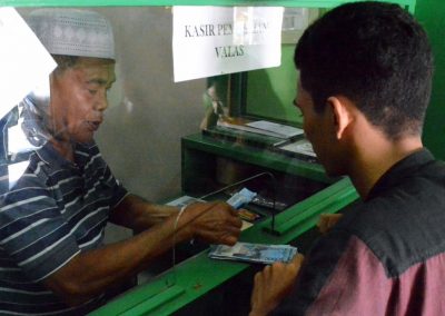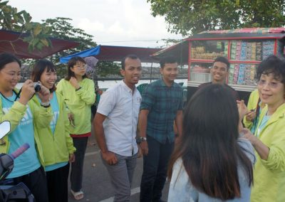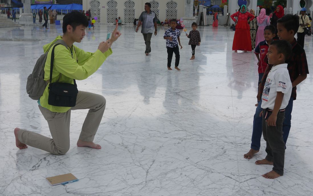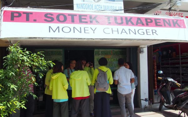 討論結束後,亞齊朋友也來了,我們下樓打招呼,他們展露熱情的笑容,大方介紹自己的名字,分別是Furqan、Fatra、Zia、Odie,以及Eka。大家彼此握了手,往後十四天的情誼就此牽起。在接下來的主行程(參訪清真寺)之前,我們安排先去處理生活上重要的兩件事:購買手機網卡與換錢。網路可以讓我們在連絡上更為方便,線上翻譯功能有助於與亞齊朋友的溝通。不過喬安與瑋哲因為手機的品牌需要另外設定網路連線,折騰到晚上才解決問題,他們也才恢復應有的活蹦亂跳。梅子決定一次換足生活營所需要的開支費用,導致店舖內的錢不夠,需要從其他地方拿來,Fatra看到老闆拿錢給梅子的時候手微微顫抖。其他夥伴則利用等待的時間與亞齊朋友聊天,學習一些基本印尼用語,建立關係。