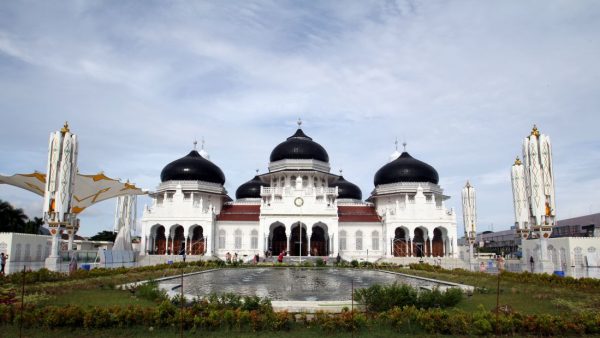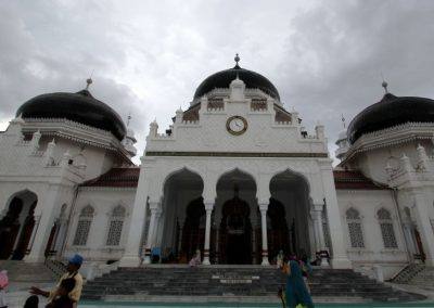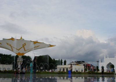 進到大清真寺,第一眼望見鋪滿純白大理石的廣場,上頭映著藍天白雲。脫鞋走上大理石地板,腳下傳來的冰涼感令人感到舒爽。廣場中央有幾道噴泉,兩側立著數把巨大的傘,人們或坐或臥的在傘下遮陽,家長帶小孩在廣場上玩耍,還有許多人與清真寺拍照留念。我們在Odie的建議下到一處能將大清真寺全數拍入的地方合照,上傳至粉專,引發廣大迴響,每個關注粉專的人對於我們戴頭巾的照片發出驚嘆。廣場上,迎面走來的穆斯林女性,穿戴著美麗的頭巾與服飾,踩著優雅的步伐,頭巾與衣襬隨著微風輕拂,相機中留下一張張美麗的倩影。我們還不習慣亞齊炎熱氣溫,加上頭巾悶熱,已是滿頭大汗,韋婷甚至出現中暑症狀,大夥兒不由得心裡默默對戴著頭巾,走在烈陽下的穆斯林女性升起一股尊敬。