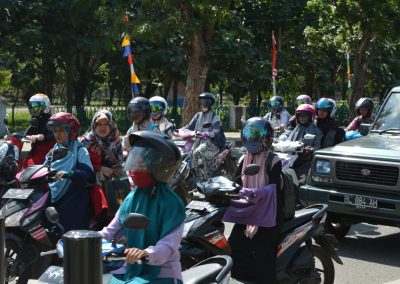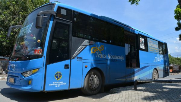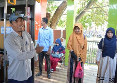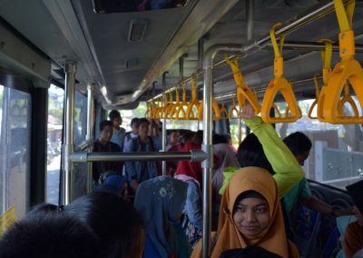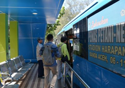 這兩年亞齊政府為了鼓勵民眾搭乘大眾運輸工具,所有的公車都是免費搭乘。在站牌處,一輛藍色公車緩緩駛入我們的眼前,不同於普遍的車門高度,公車的車門高度約離地面一百公分左右,這是為了避免當地人習慣性地招手就順便上車,影響公車秩序跟路況,連帶公車站的設計,也是「高人一等」的。