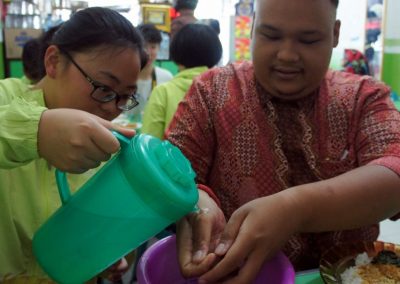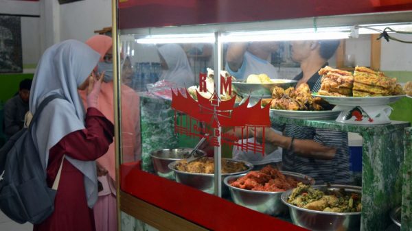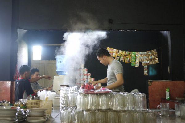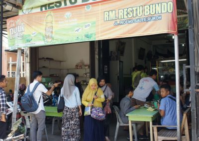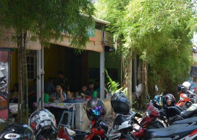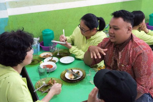 用餐的地方位在亞齊大學附近的巴東料理店(Restu Bundo),抵達時雖然已經過了正常的用餐時段,但店內還是塞滿了學生。我們在用餐過程中認識了這家店的老闆與在亞齊大學工作的Dian,他是位美食家,於是梅子讓喬安與婉琦下午找時間向他們兩位請教巴東料理的基本特色。