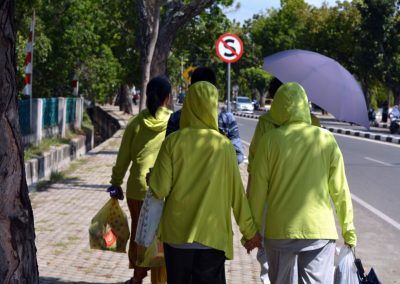 信心大增的我們決定再為夥伴們買杯冰涼的果汁,決定到附近的果汁攤看看。由於亞齊賣的飲料特甜,我們點了不加糖的果汁。在等待的時候,瑋哲突然對著店員用中文大叫:「不可以加糖!」原來儘管說過了不用加糖,店員還是在打好的果汁裡放了「三大匙」,我趕緊用印尼語向店員強調「Tidak mau gula」(不用加糖),他才急忙改正過來。順利買完了炒飯跟果汁,我大大地鬆了一口氣,瑋哲也說:「其實出來買飯也沒這麼難嘛。」原本以為語言不通的我們,在沒有亞齊朋友的幫忙下會寸步難行,因此做好了隨時向他們求救的準備,沒想到並沒有派上用場。