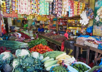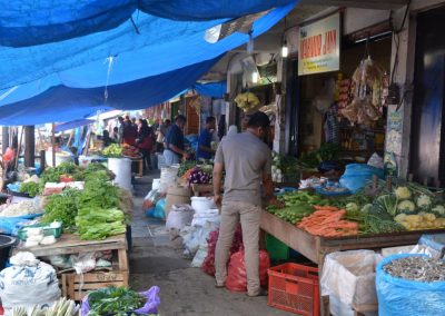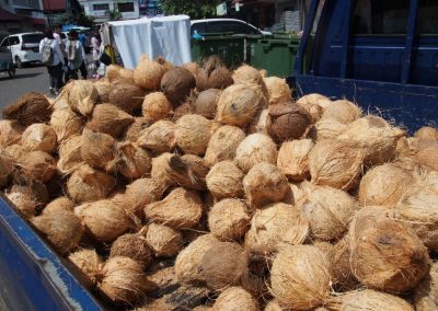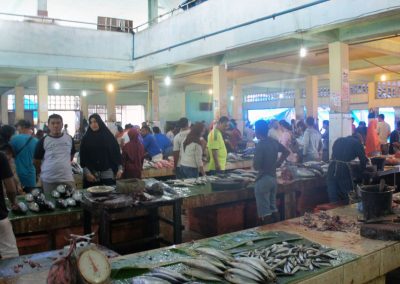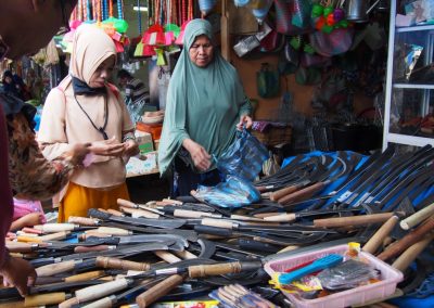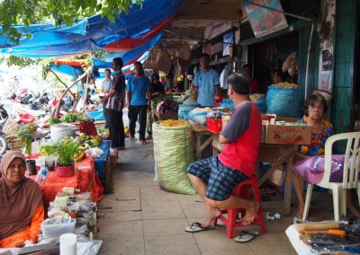 今日上午去的大市場「頗奈庸市場」(Pasar Peunayong)是班達亞齊規模最大的批發市集。和台灣的傳統市場相似,人潮跟車輛在路上交雜,空氣中瀰漫廢氣與蔬果殘渣的腐敗氣味。馬路兩側有著各式各樣的攤販與店家,不少的攤子上頭會拉起一大片遮陽用的藍色帆布。