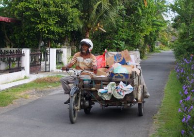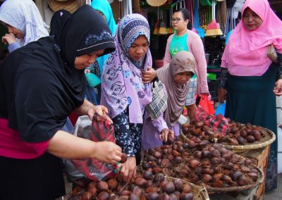 我還來不及坐下,Fatra便拉著我到旁邊的攤子買了一顆榴槤與大家分食,口感綿密又香又濃,比我們在台灣吃到的「進口貨」好吃太多了;梅子也拿出稍早買的蛇皮果與紅毛丹,芸芸吃了紅毛丹,一臉幸福地說這是她這輩子吃過最好吃的水果。市場之旅在眾人吃水果談笑當中畫下句點。