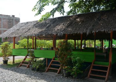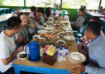 中午的用餐地點是著名餐館「哈珊飯館」(Warung Nasi Hasan)的分店,在班達亞齊頗受歡迎,專門提供亞齊料理,建築物是半露天的高腳屋,用餐時還能欣賞外面的風景。一就坐店員便迅速上菜,長桌上瞬間排滿大大小小的盤子,每人面前都有個裝了飯的圓盤。面對滿桌的合菜,我們不太清楚要如何用手食,芸芸、婉琦跟梅子觀察後發現,亞齊朋友都會一次將想吃的菜餚抓取好放進自己的盤子,並會互相傳遞、詢問其他人要不要吃這道菜;若吃不夠要再添加時,會先將右手洗過,再進行下一輪的取菜。恍然大悟的眾人,依樣畫葫蘆地取菜,享用滿桌的佳餚。在店員跟Fatra的介紹下,我還品嘗了由許多香料混雜製成的「酸蝦醬」(asam udang)跟「椰子醬」(pliek ue),但只感受到特別突出的酸味。