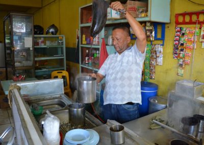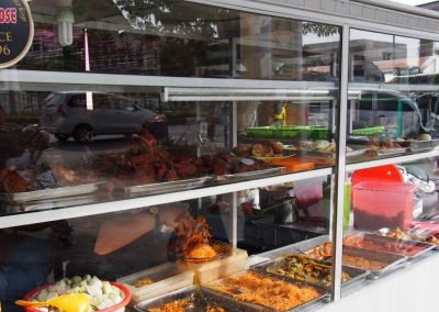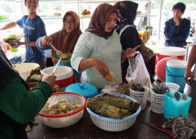近九點,肚子咕嚕咕嚕叫的大家興奮地跳下車,跟著亞齊朋友走進早餐店 (Mami Yose)。門口的櫥窗裏放滿各種菜餚,店內最深處是飲品調理區。見到一群外國人進到店裡,店家與其他客人對我們的態度相當友善,不僅會主動與我們攀談,問從那裡來,見每個人手拿相機,也大方地露出笑容讓我們拍照。離開前,我們還跟老闆一起拍了合照。