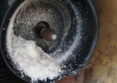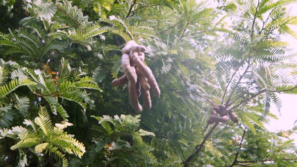 一大清早我們到宿舍附近走走。和煦的日光伴隨微風輕輕吹拂,恣意走在路上,讓人心曠神怡。拐個彎兒,不遠處的樹下聚集四位男子,身旁有幾個飽滿直立的麻布袋,抬頭一看還有兩個人在樹上。梅子上前攀談,原來他們正在採收羅望子,好奇的夥伴們紛紛拿起羅望子嘗鮮,跟著指示撥開像豆莢的乾硬外殼,內有褐色軟嫩的果肉,酸中帶甜,味道很像烏梅。好酸的梅子非常喜歡,連續吃了好幾串,大呼:「好好吃喔!」為今日的舌尖體驗拉開序幕。